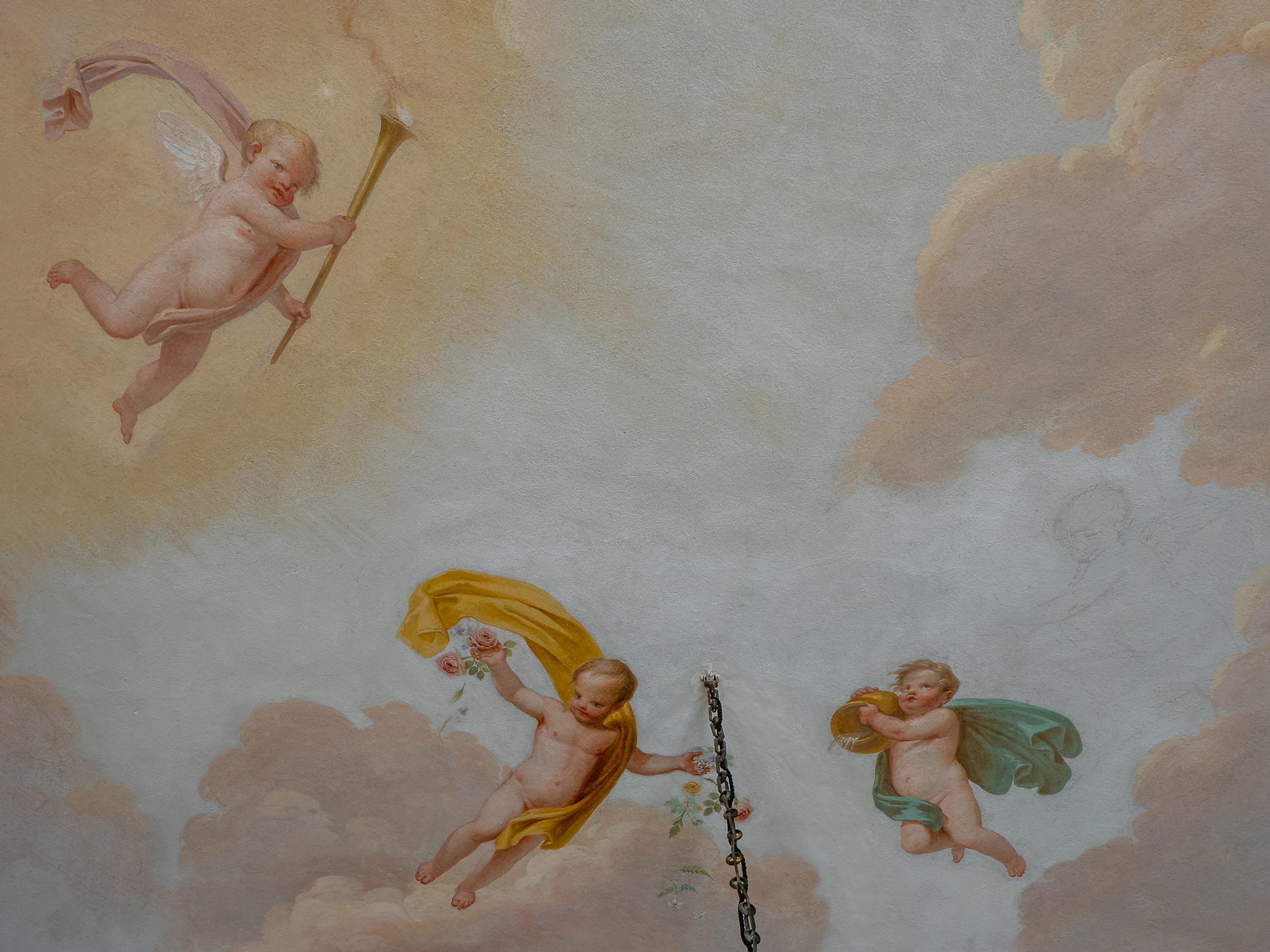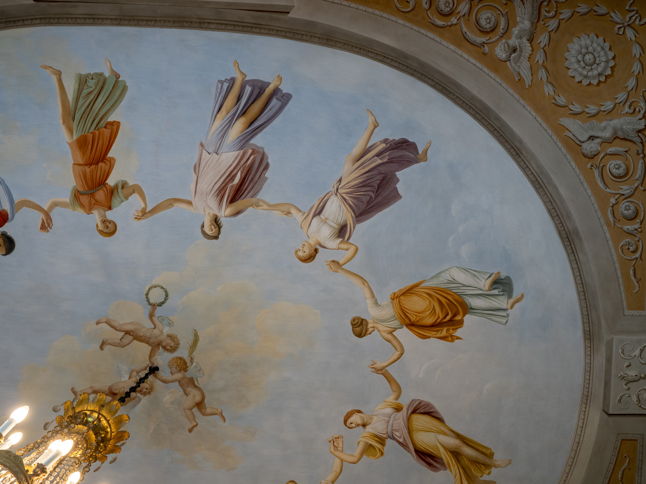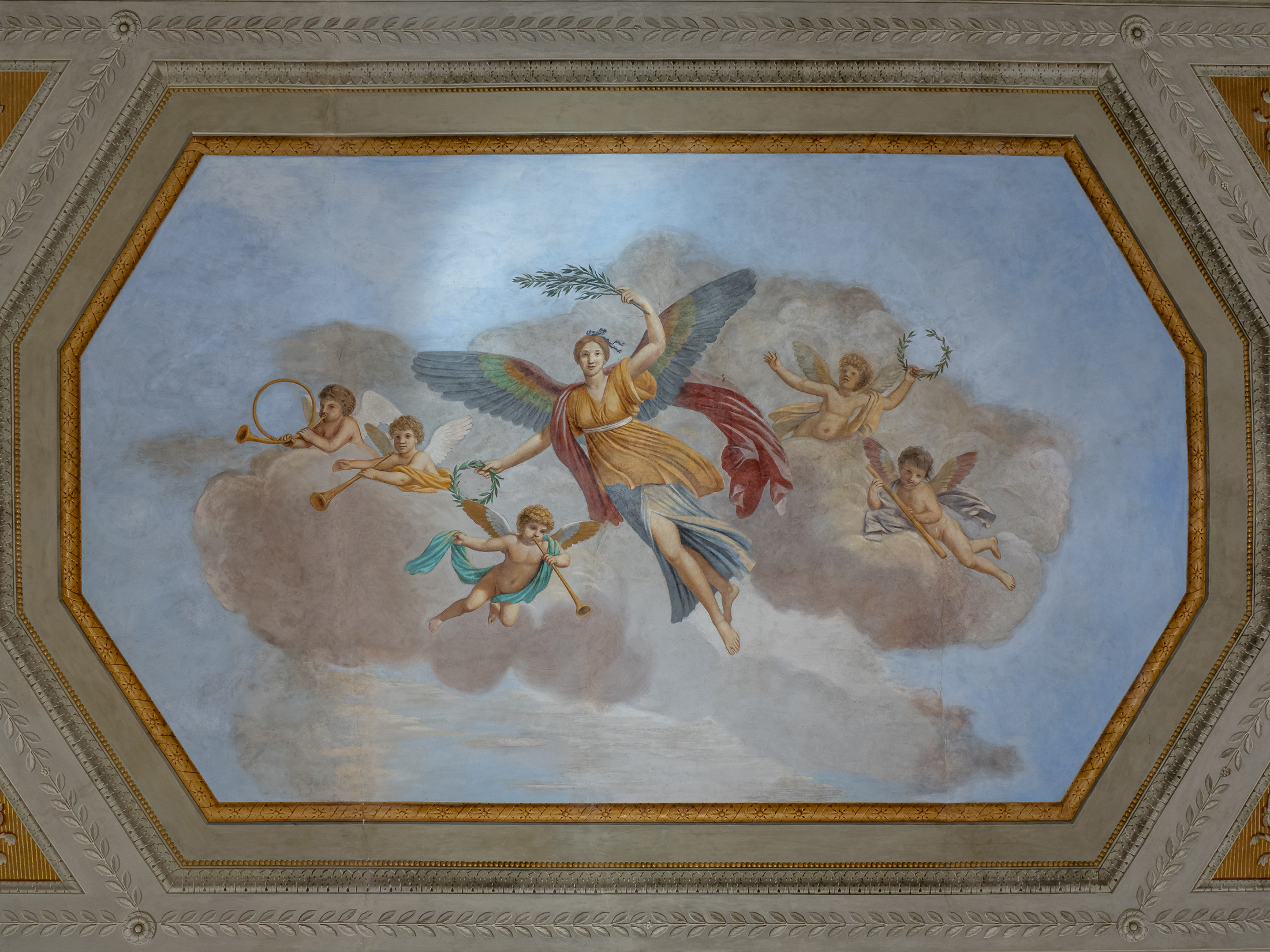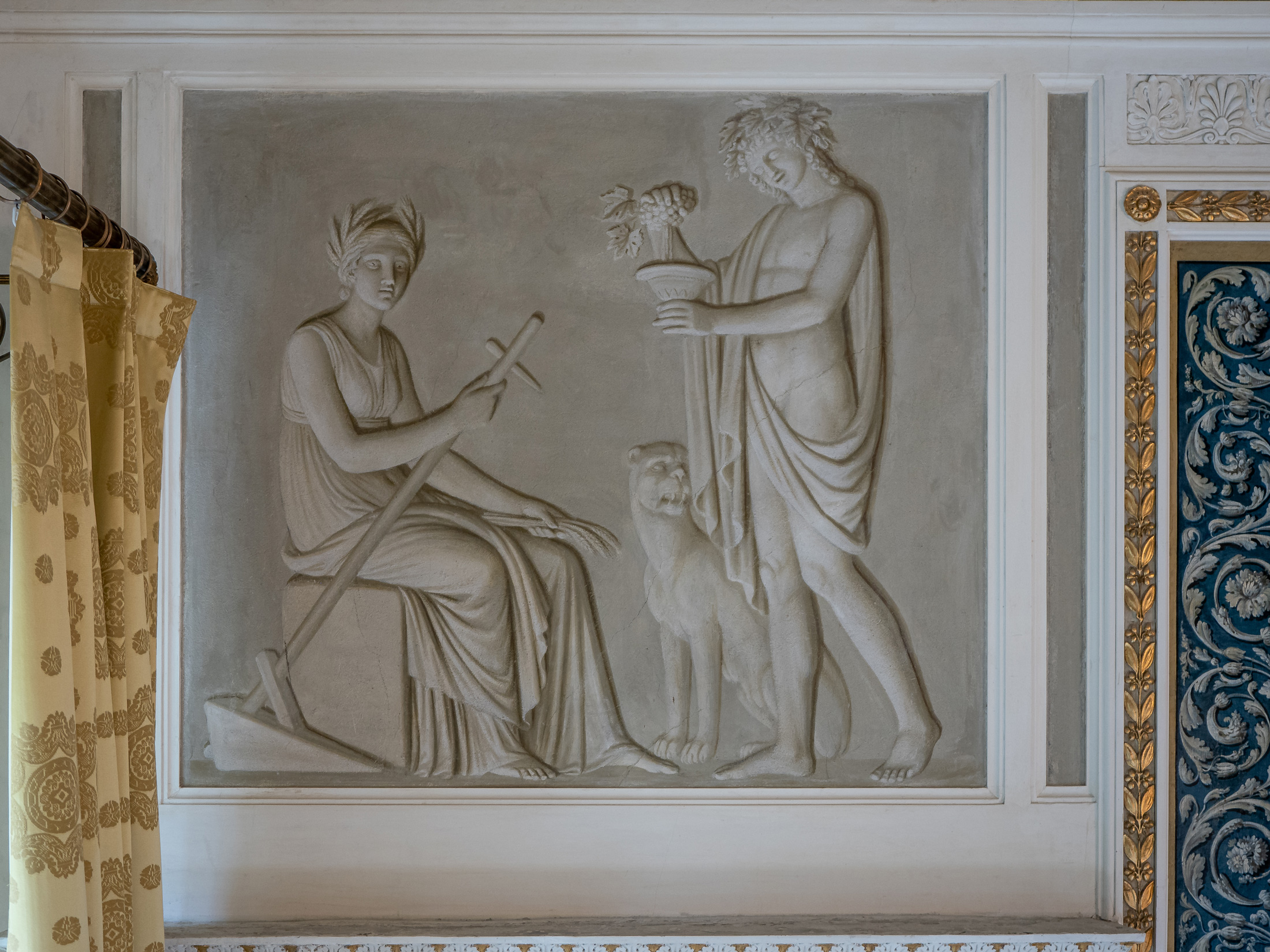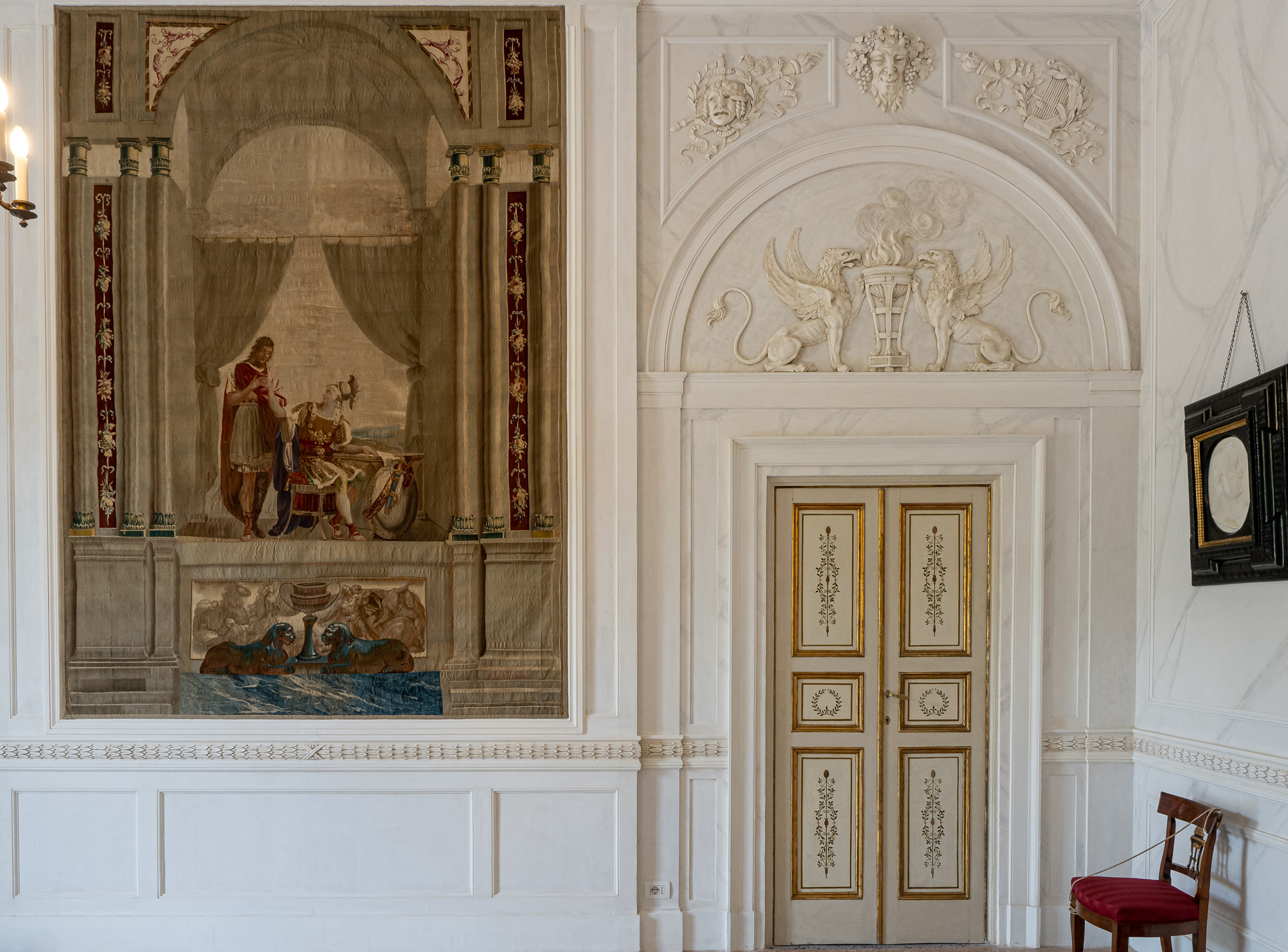 Gli stucchi che abbelliscono questo ambiente sono i più raffinati della Villa. In risalto sulla parete il grande arazzo ispirato all’antica Roma.