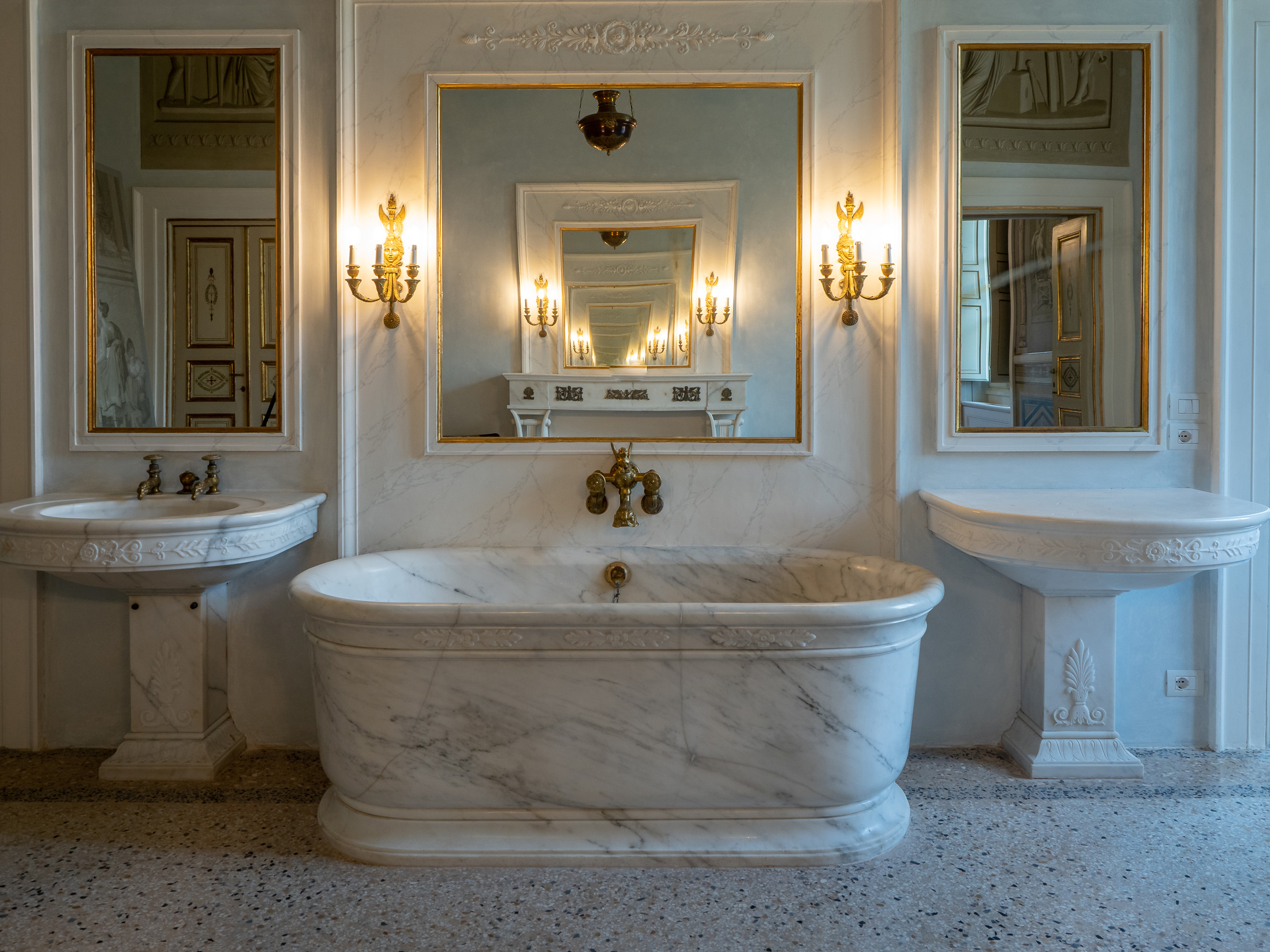 Questo ambiente colpisce per l’insolita raffinatezza dei suoi arredi in marmo bianco di Carrara.