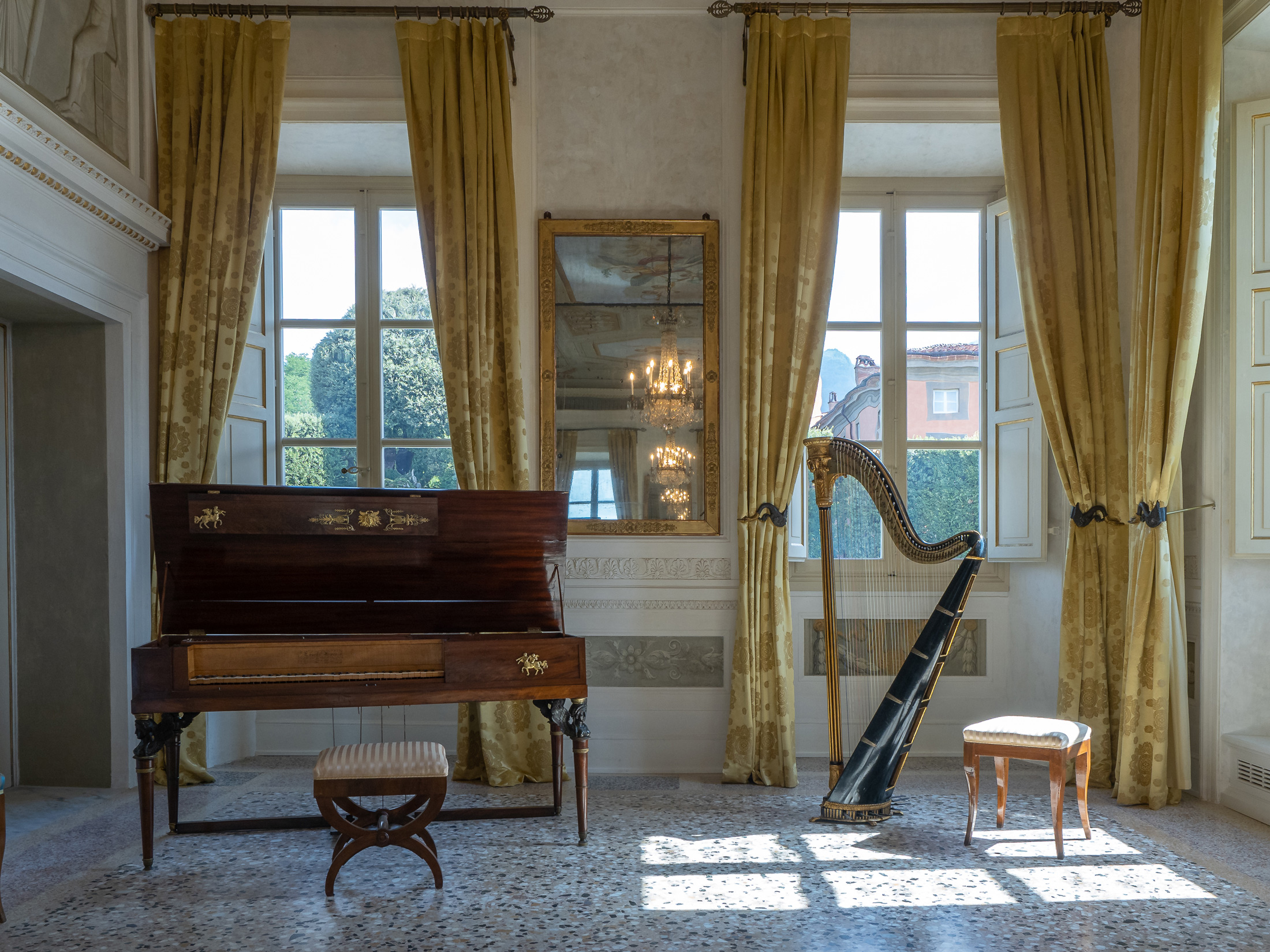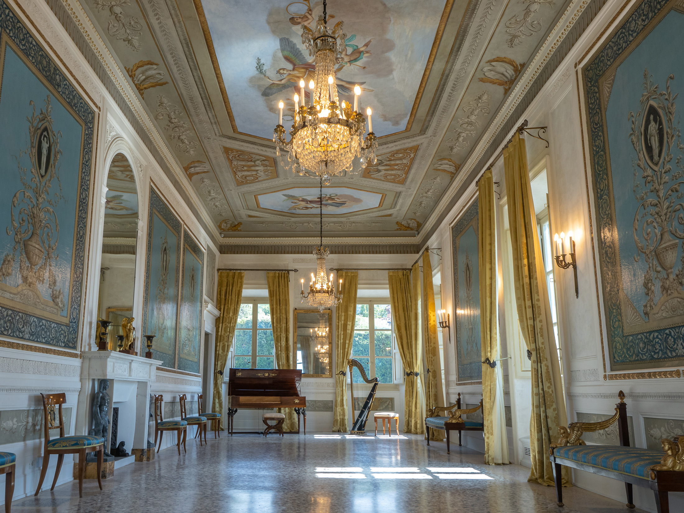 Riccamente decorata, questa sala ospita un’arpa e un fortepiano di inizio Ottocento testimoni delle innumerevoli feste e balli in maschera.