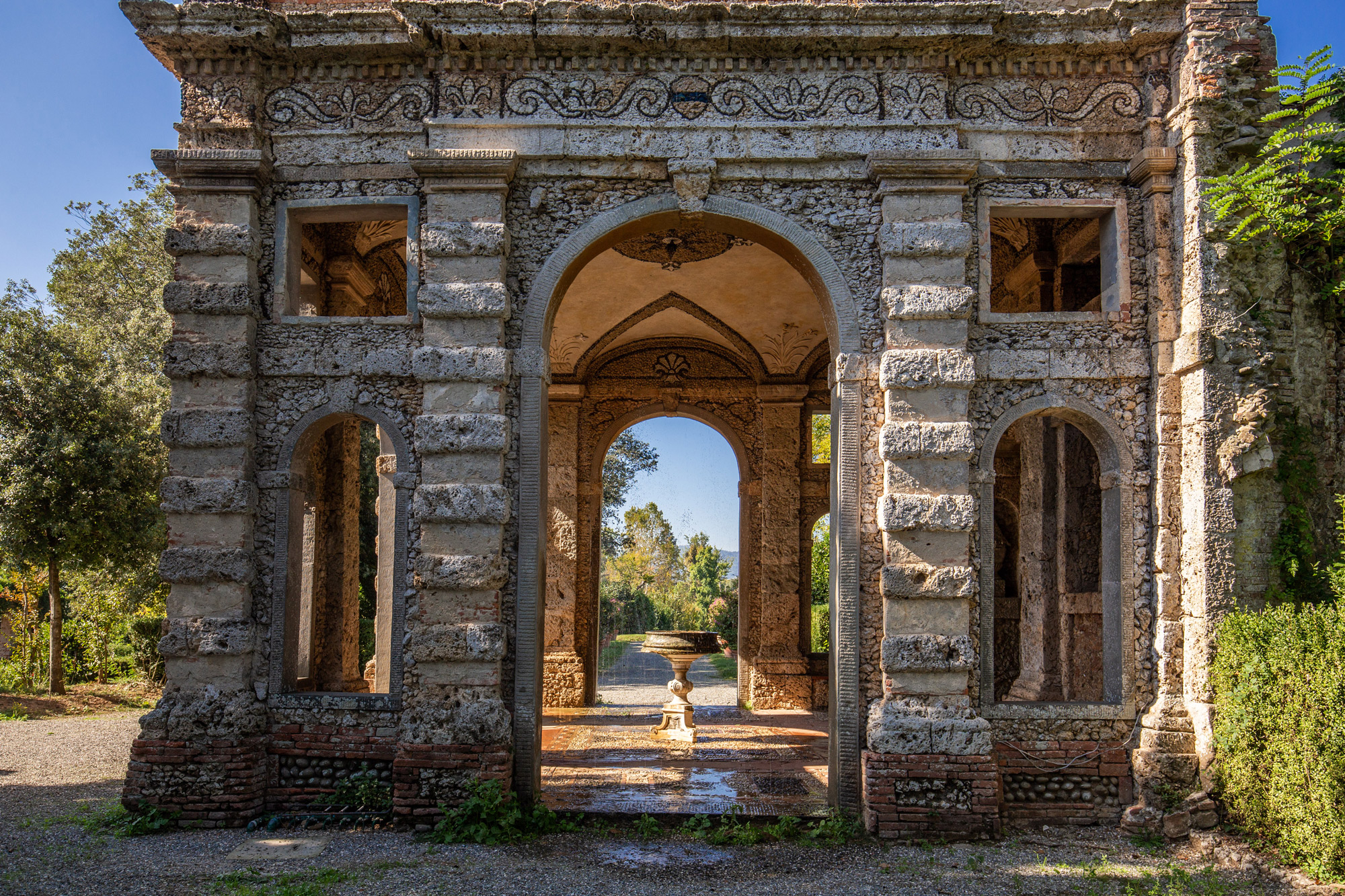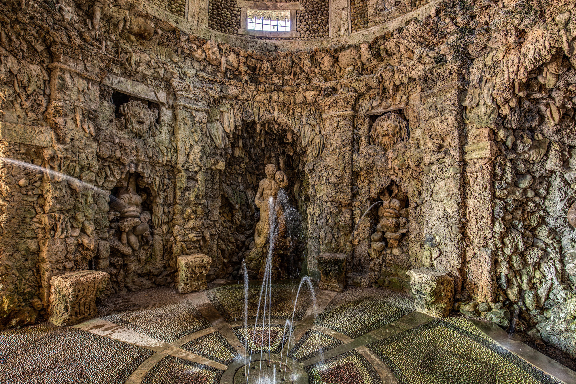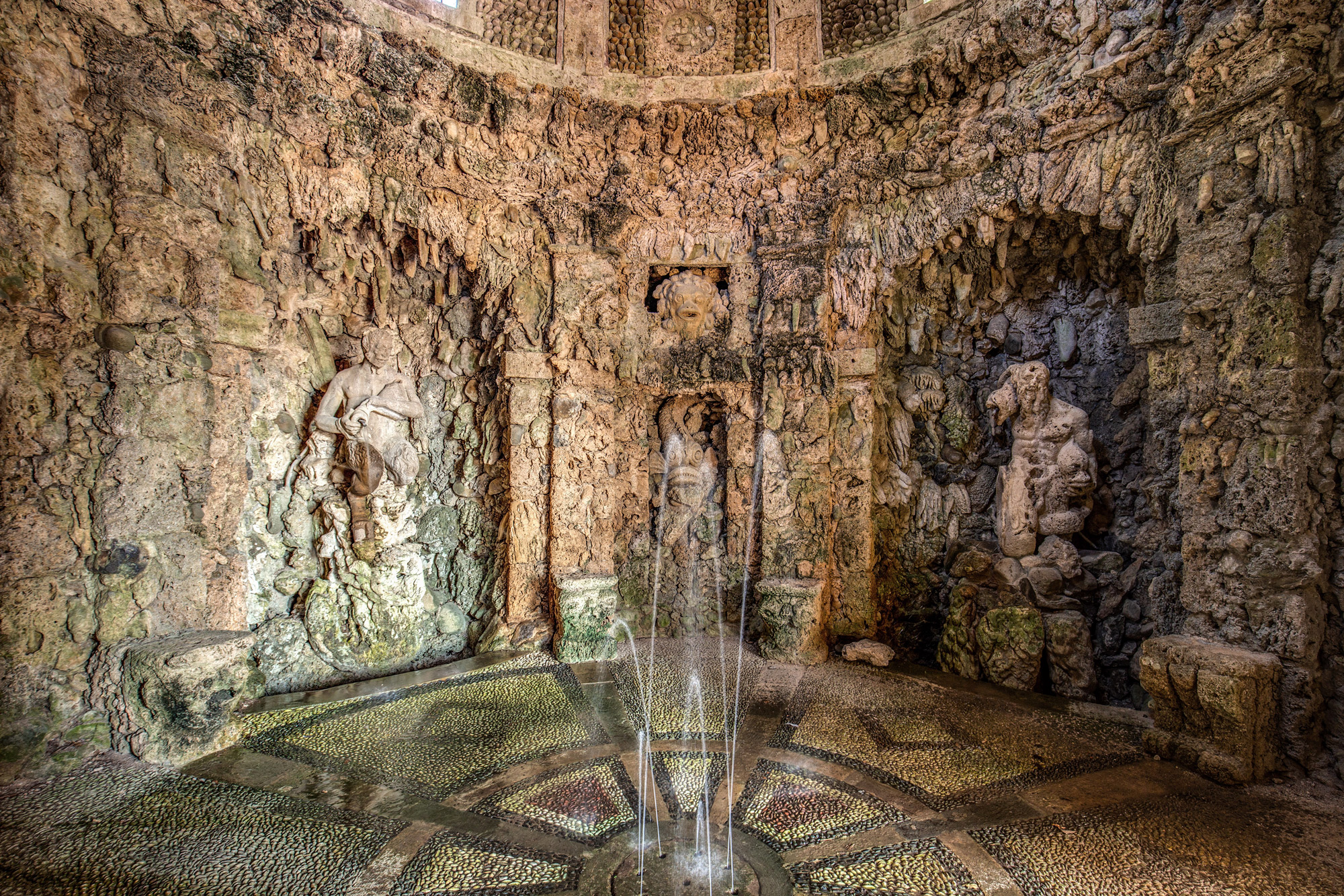 Par l’entrée aux grandes arcades, on accède à un espace imitant une grotte, éclairée par un simple oculus situé en haut de la voûte. Les parois sont recouvertes d’incrustations calcaires et sont décorées avec des masques étranges et des niches à l’intérieur desquelles sont situées la statue du dieu Pan et les figures marines anthropomorphes.